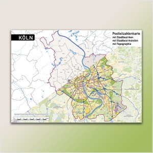 Karte Köln Stadtplan Postleitzahlen 5-stellig PLZ-5 Topographie Stadtbezirke Stadtteile Vektorkarte Köln Postleitzahlenkarte
