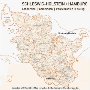 Karte Schleswig-Holstein / Hamburg Landkreise Gemeinden PLZ-5 Postleitzahlen 5-stellig Vektorkarte