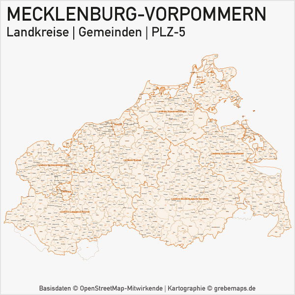 Karte Mecklenburg-Vorpommern Bundesland Landkreise Gemeinden PLZ-5 (Postleitzahlen 5-stellig) Vektorkarte