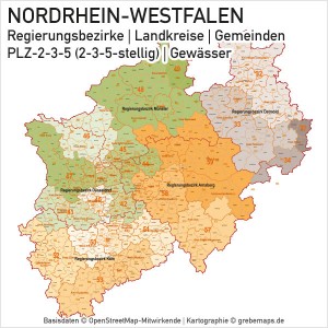 Karte Nordrhein-Westfalen NRW Bundesland Landkreise Gemeinden PLZ-2-3-5 (Postleitzahlen 2-stellig, 3-stellig, 5-stellig) Vektorkarte