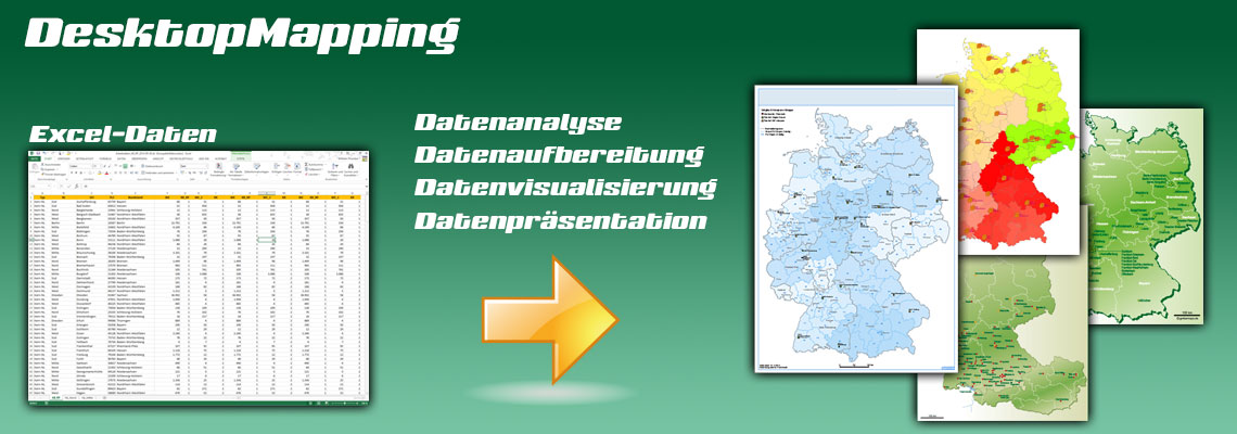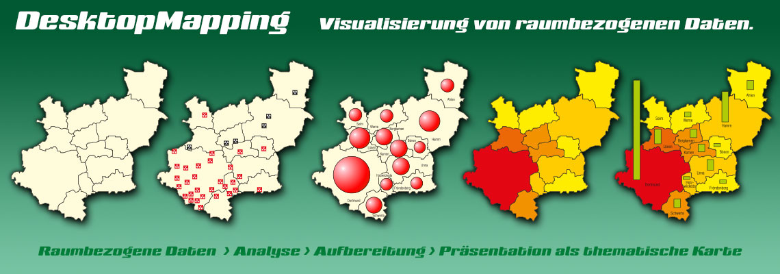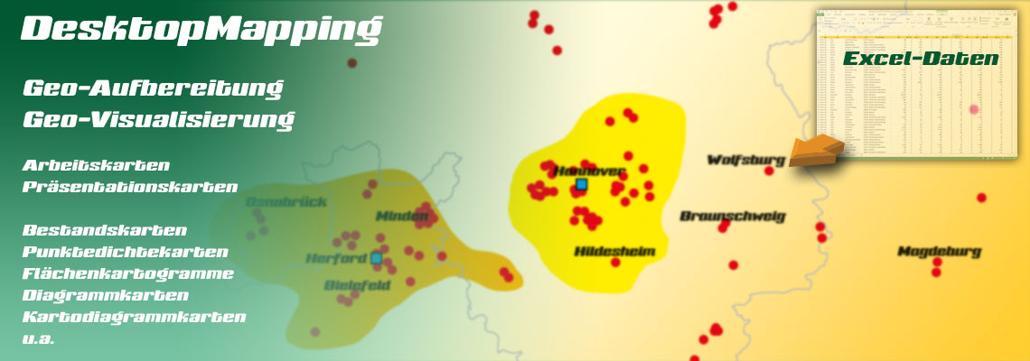 DesktopMapping / Standort-Visualisierung / Vertriebsgebiete: Dieser Punkt umfasst die geographische Datenanalyse von raumbezogenen Daten mit Hilfe eines DesktopMapping-Systems. Räumliche Daten werden erhoben, aufbereitet, analysiert und schließlich visualisiert anhand von Arbeits- und/oder Präsentationskarten. Diese Anwendungen finden Ihren Einsatz z.B. Visualisierung von Kundenstandorten oder der kartographisch-thematischen Visualisierung von Unternehmensdaten.