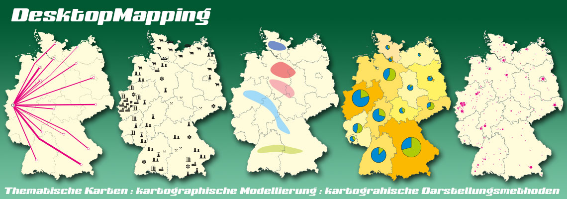 Thematische Karten: Zur kartographischen Visualisierung von raumbezogenen Themen oder Sachverhalten mit Hilfe der kartographischen Darstellungsmethoden (z.B. Diagrammkarten, Punktekarten, Vektorenkarten, Flächendichtekarten).
