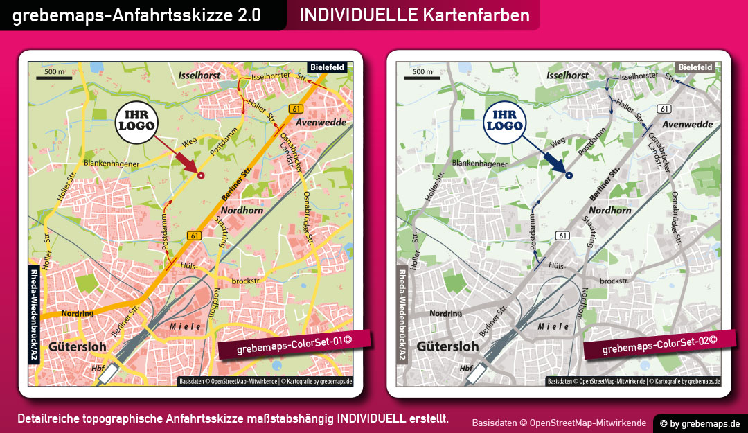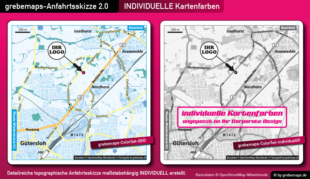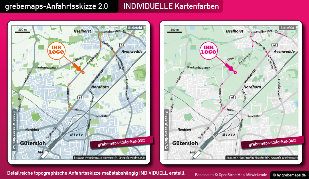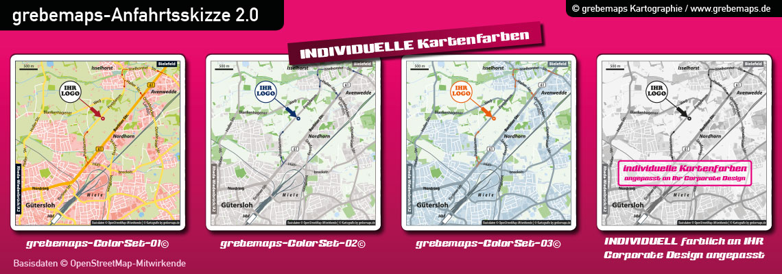 - ANFAHRTSSKIZZEN-FARBEN: grebemaps-ColorSet© oder farblich individuell angepasst an Ihr Corporate Design