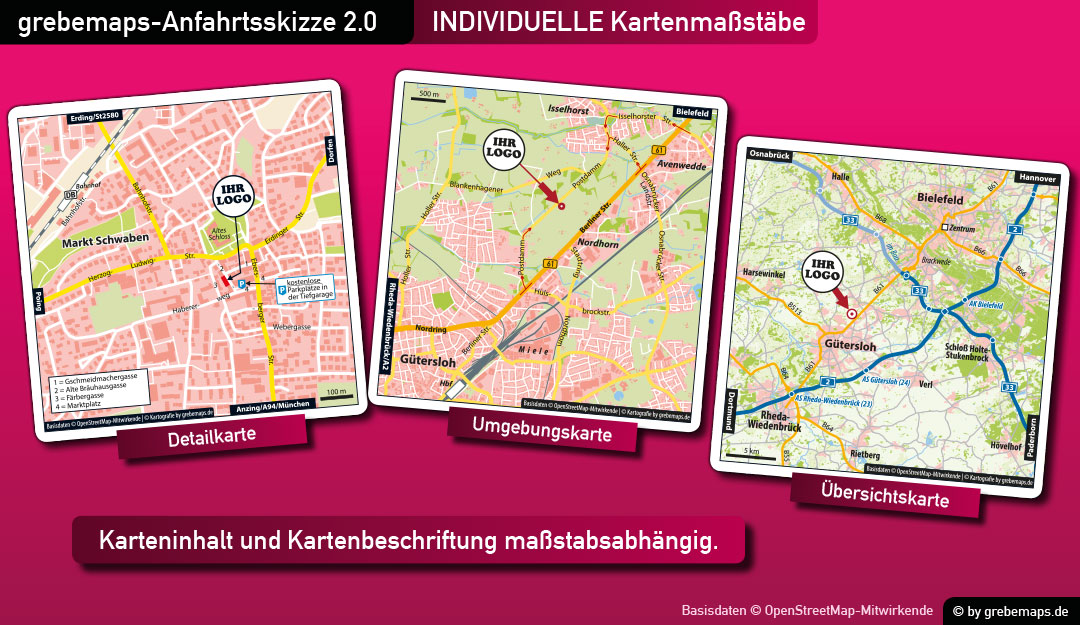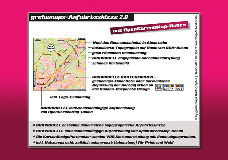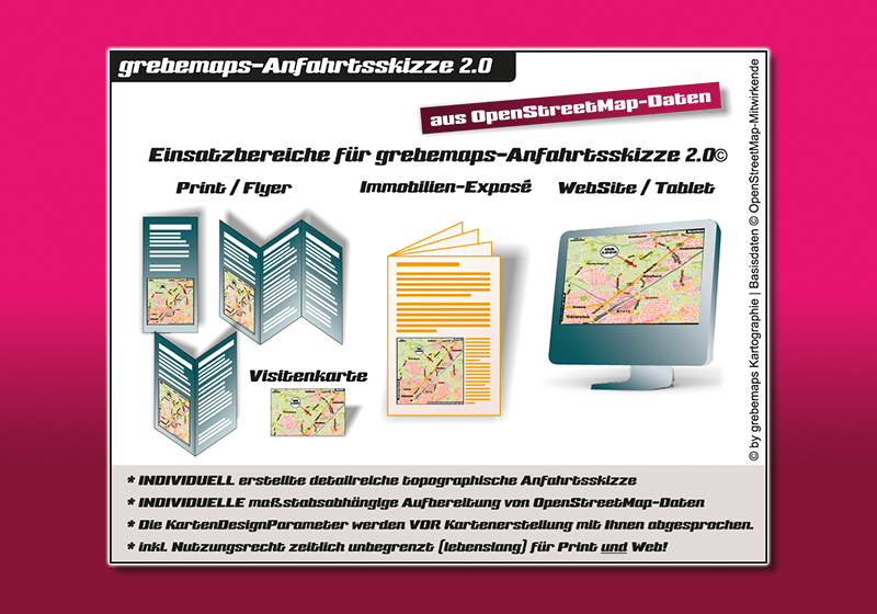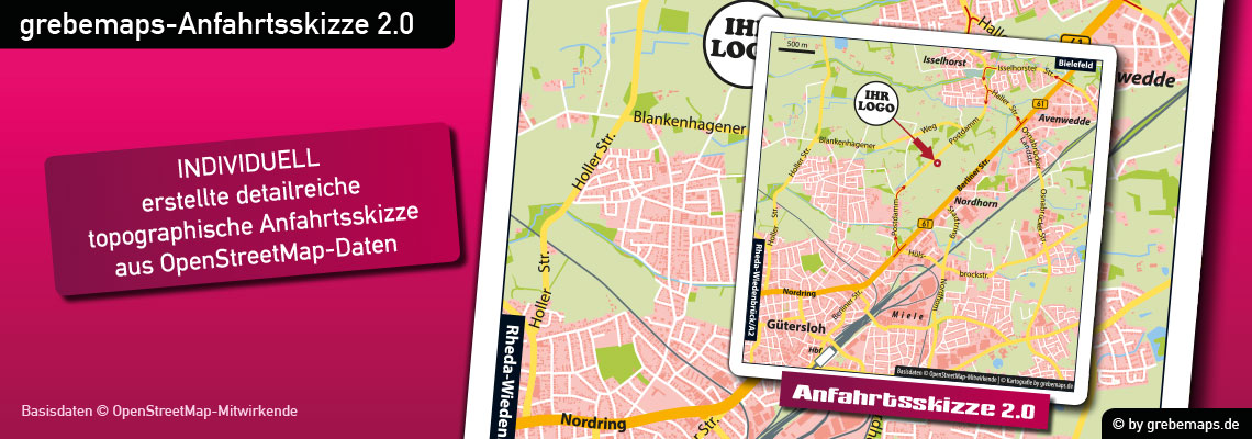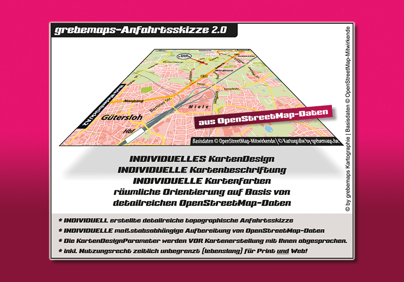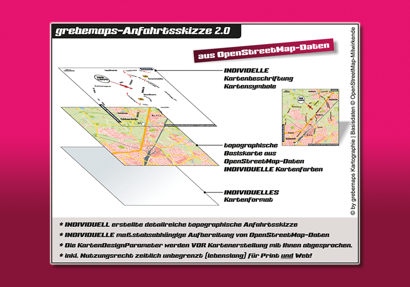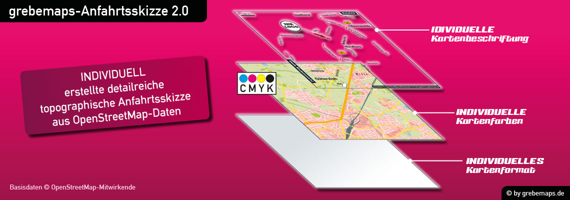 Die „grebemaps-Anfahrtsskizze 2.0©“-Inhalte werden INDIVIDUELL abgestimmt auf Ihre Zwecke und Ihren Bedarf sowie auf Ihr Corporate Design. Ihre Wünsche zur Anfahrtsskizze können Sie mit Diplom-Geograph und Kartograph Ulrich Grebe VOR der Anfahrtsskizzen-Erstellung besprechen. So erhalten Sie eine zweckvolle topographische Anfahrtsskizze, basierend auf kostenlosen OpenStreetMap-Daten.
