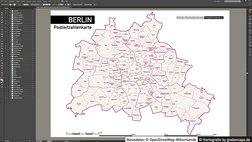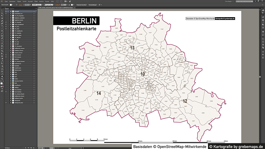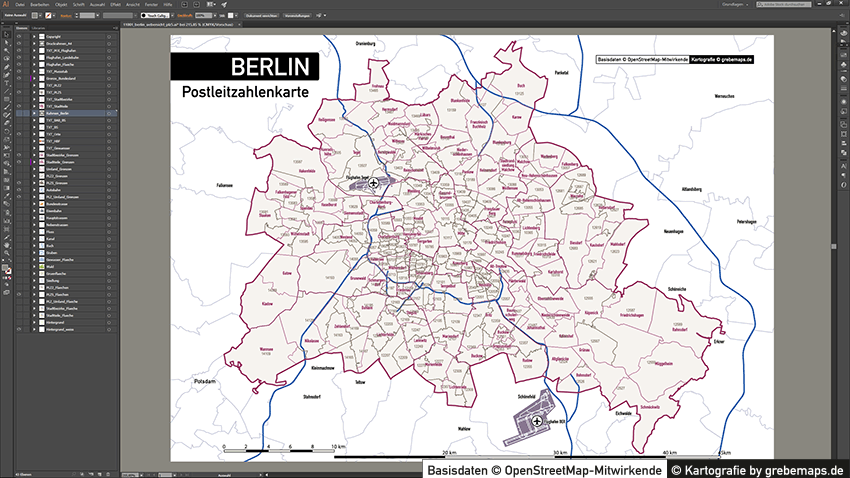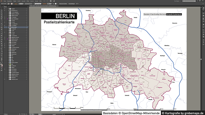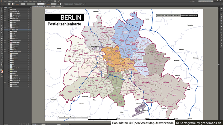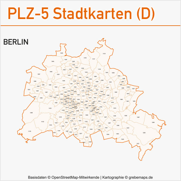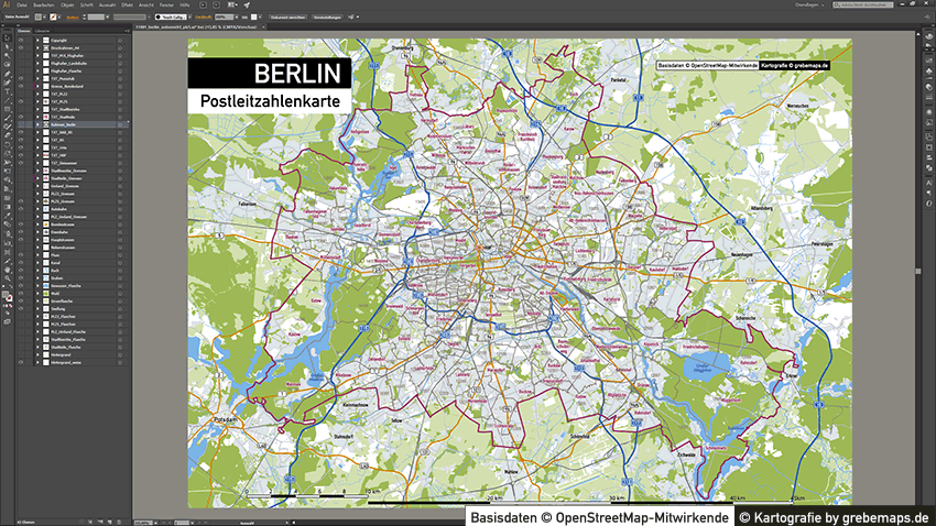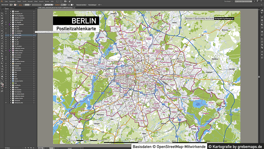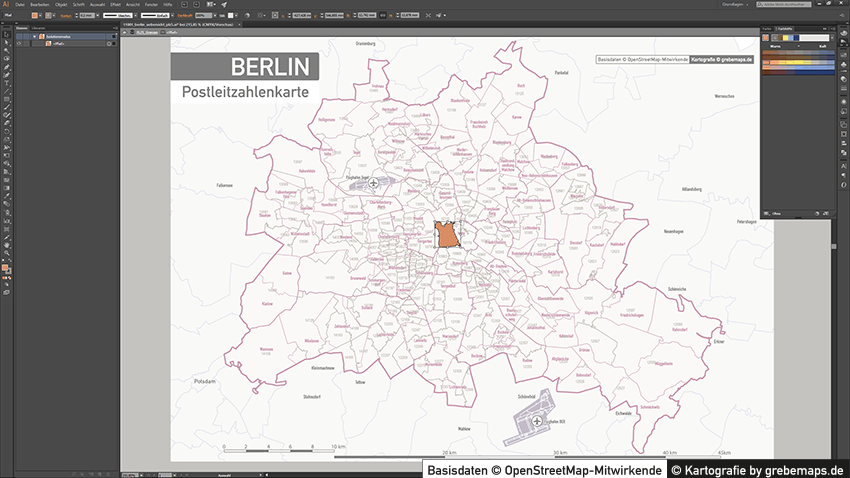 Diese fertig aufbereitete Postleitzahlenkarte Berlin für Illustrator mit Postleitzahlen-Bereichen (5-stellig) und Postleitregionen (2-stellig) mit Bezirksgrenzen und Stadtteilgrenzen zeigt Ihnen eine beispielhafte mögliche Visualisierungs-Umsetzung. Diese fertige Karte „Postleitzahlenkarte Berlin“ können Sie unter www.kartendesign.de erwerben und als Download-Link erhalten.