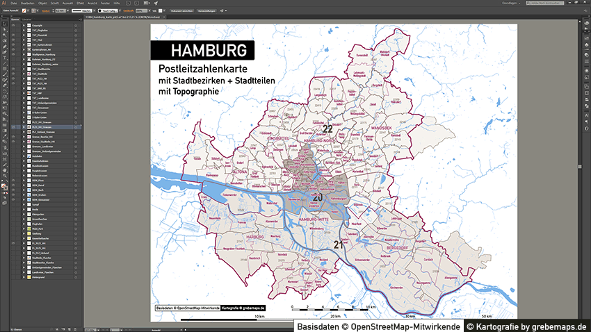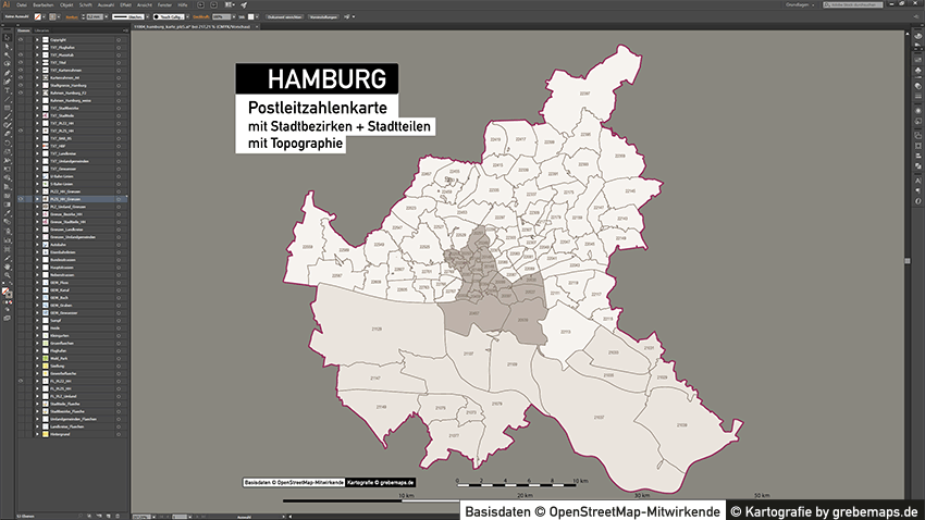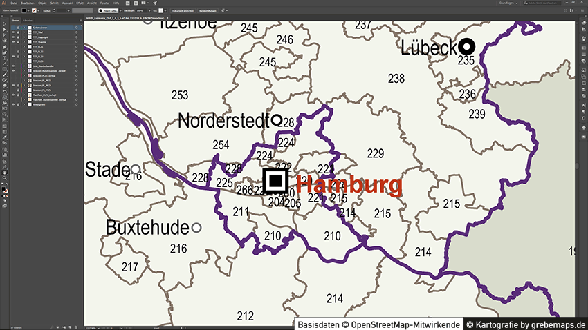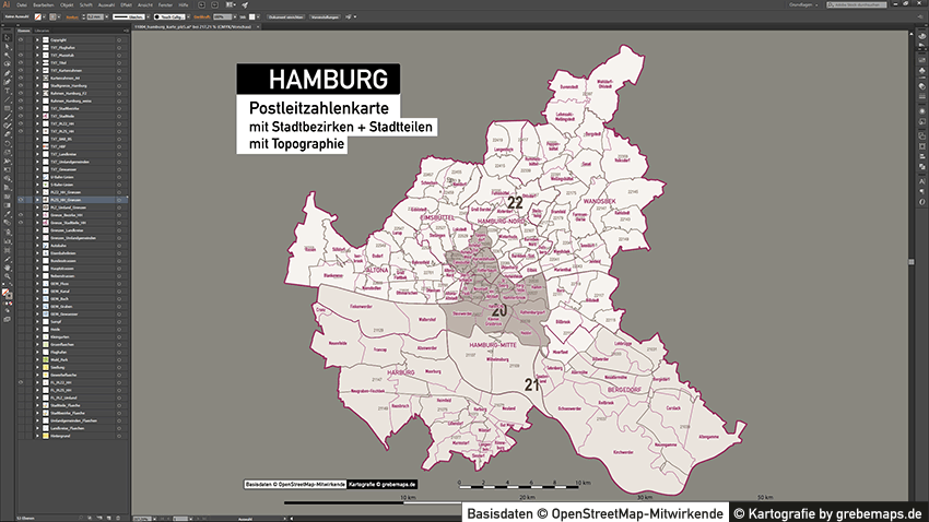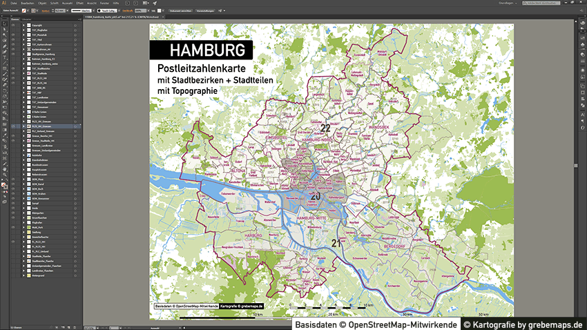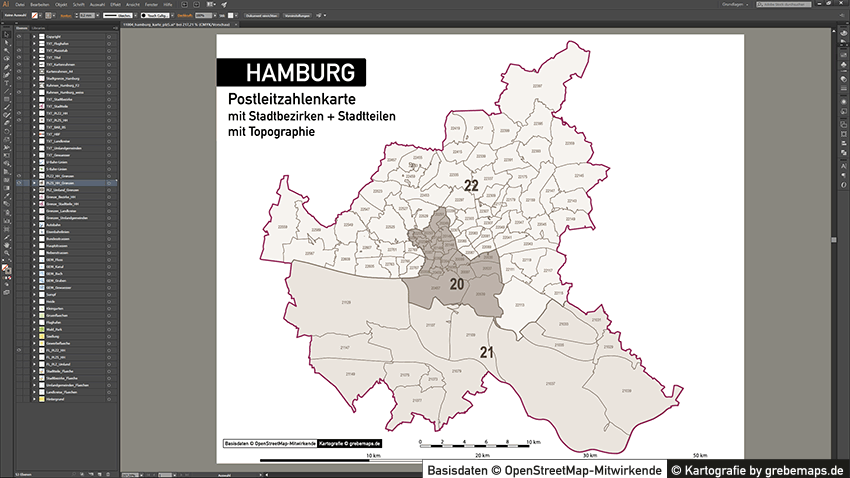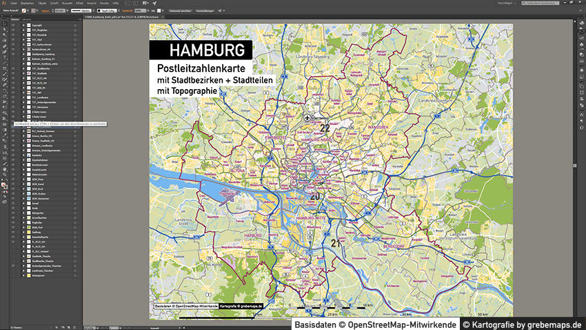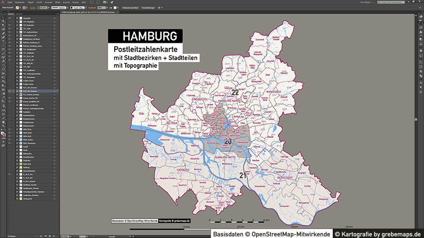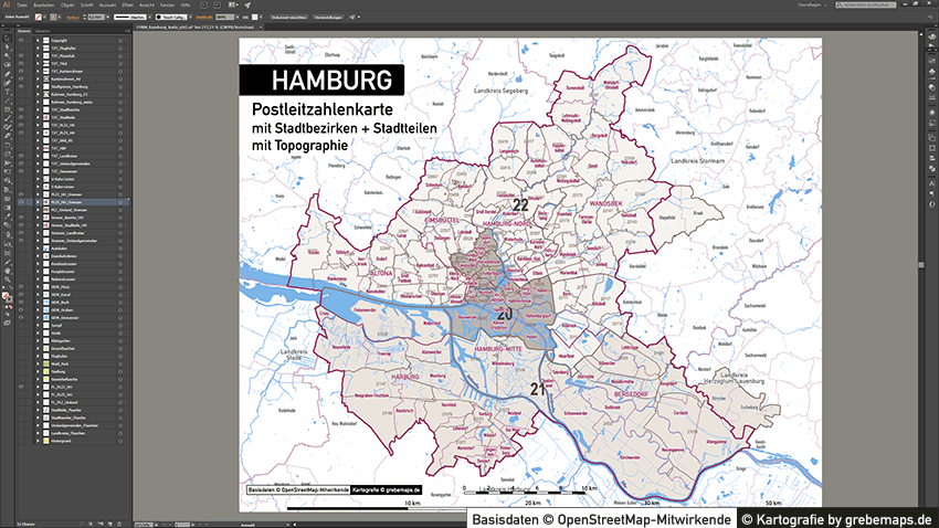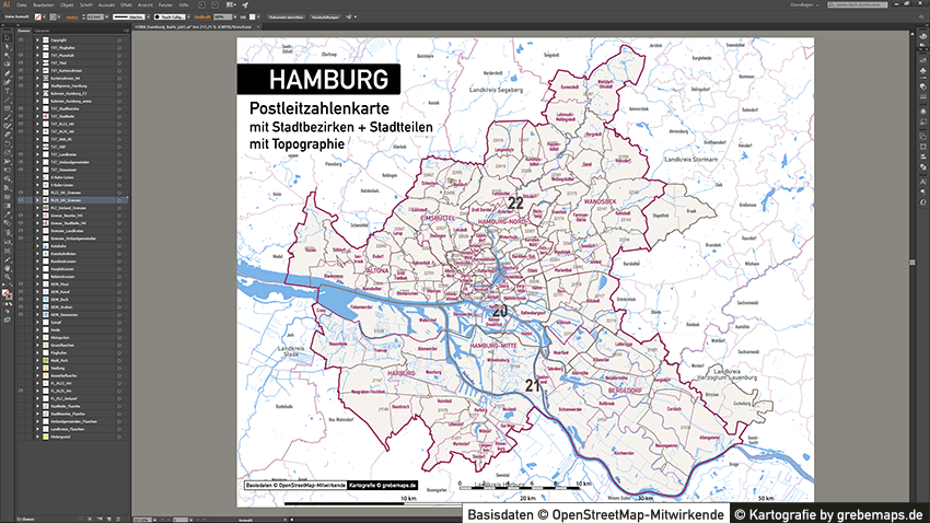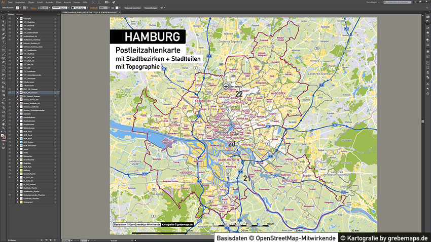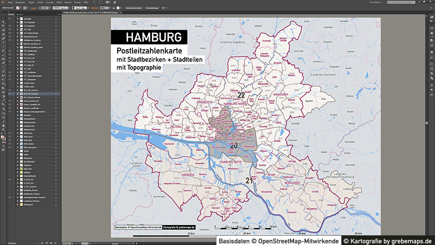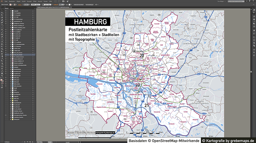 Diese fertig aufbereitete Postleitzahlenkarte Hamburg für Illustrator mit Postleitzahlen-Bereichen (5-stellig) und Postleitregionen (2-stellig) mit Bezirksgrenzen und Stadtteilgrenzen zeigt Ihnen eine beispielhafte mögliche Visualisierungs-Umsetzung. Diese fertige Karte „Postleitzahlenkarte Hamburg“ können Sie unter www.kartendesign.de erwerben und als Download-Link erhalten.