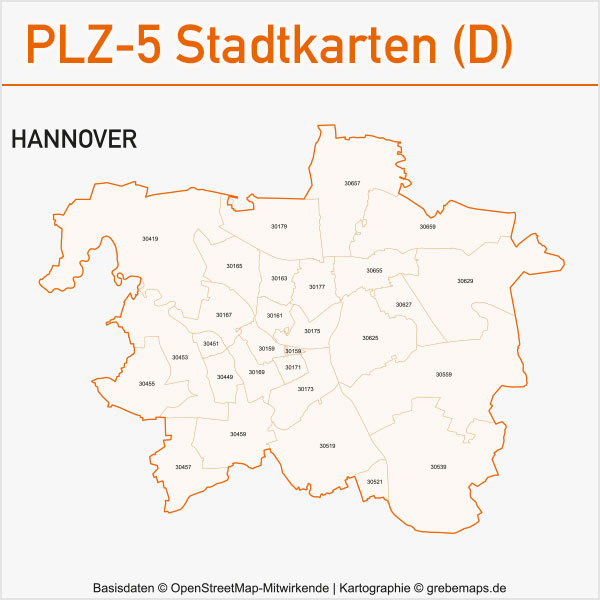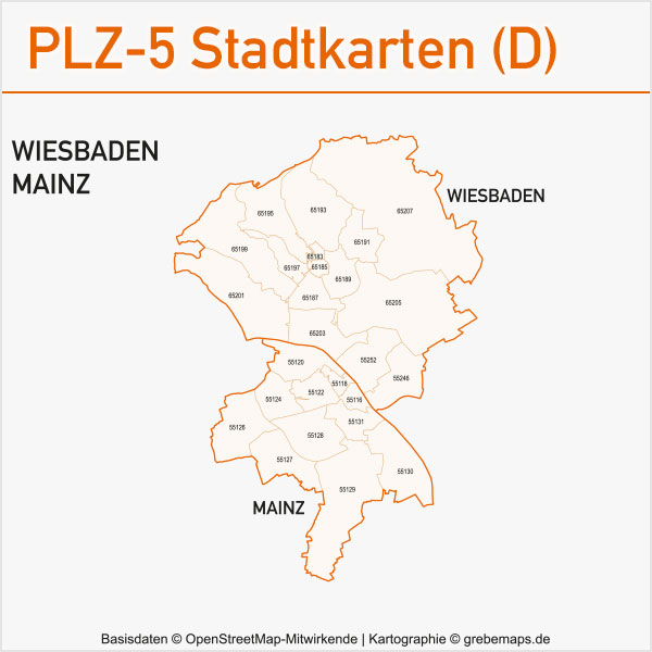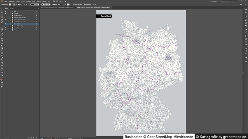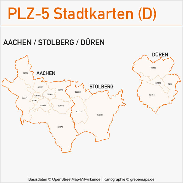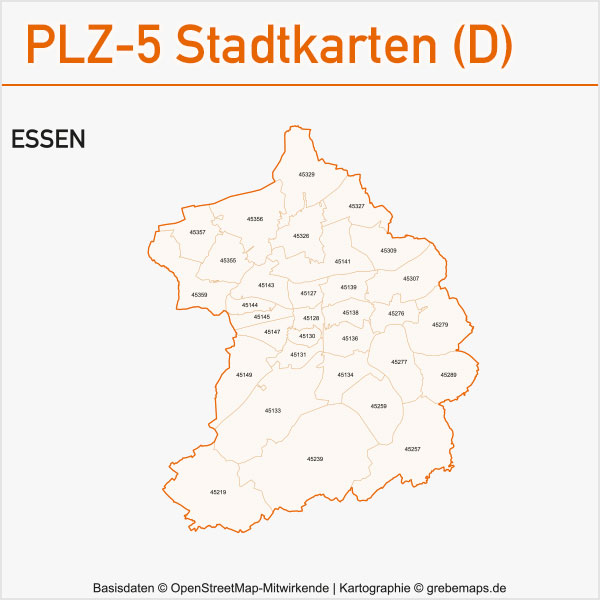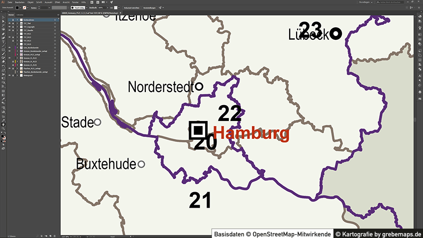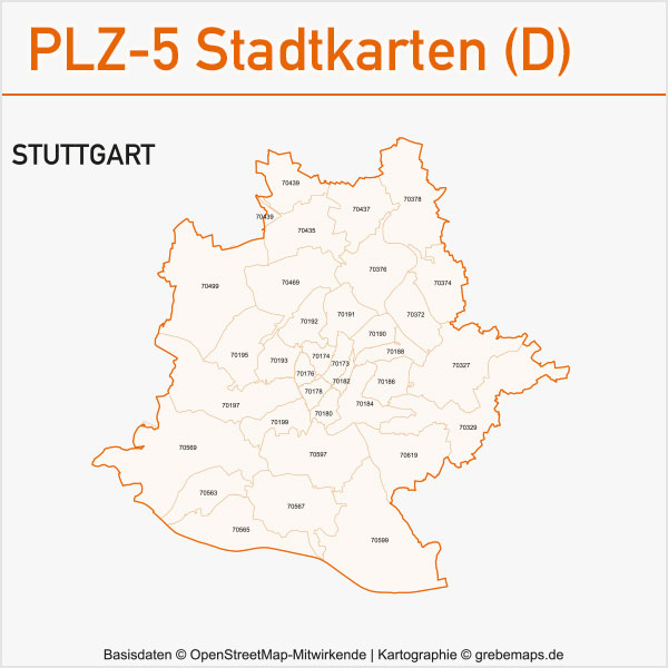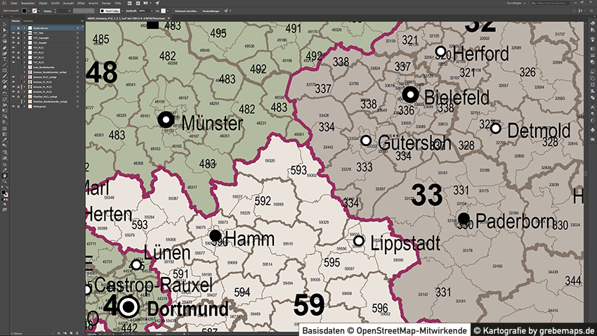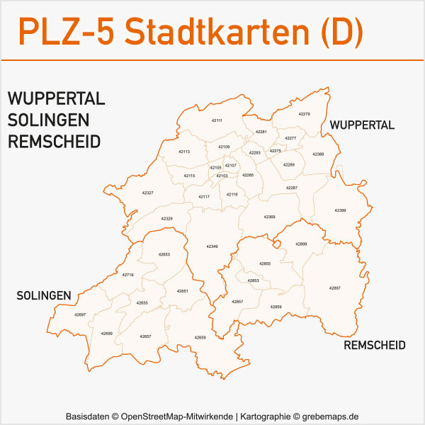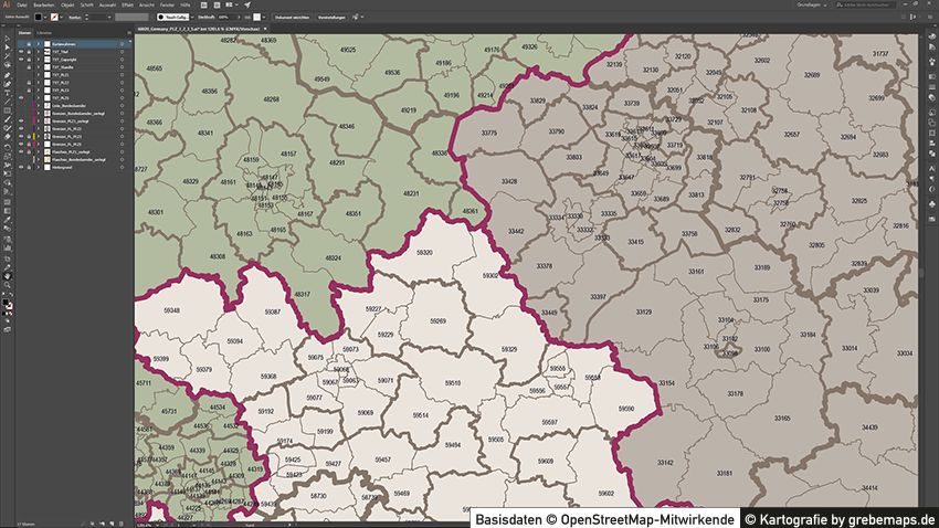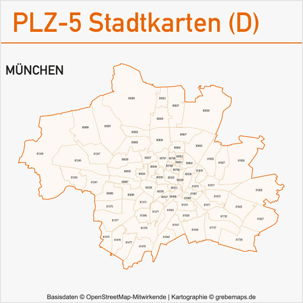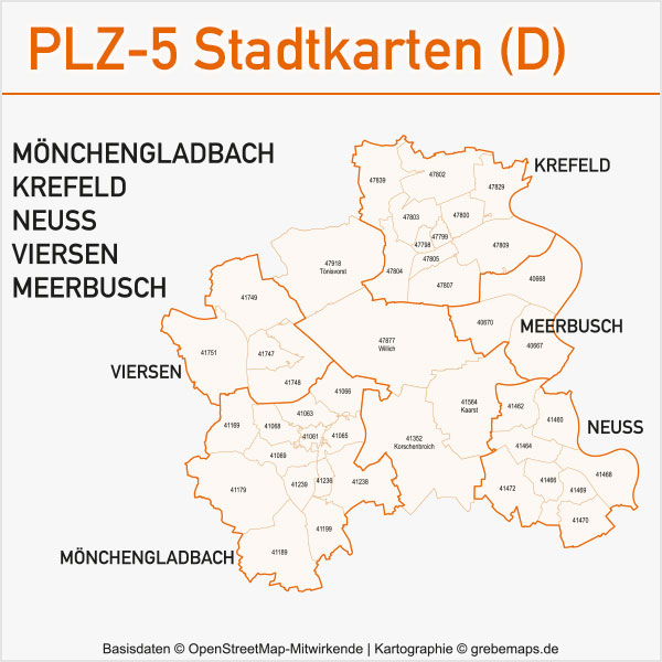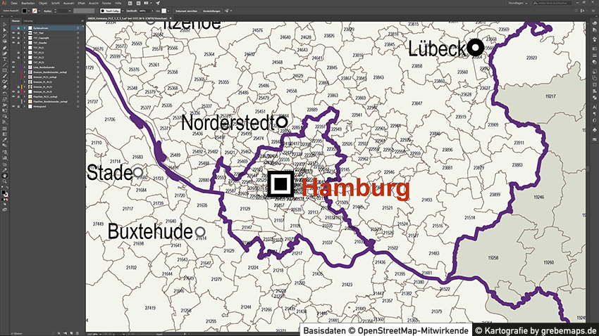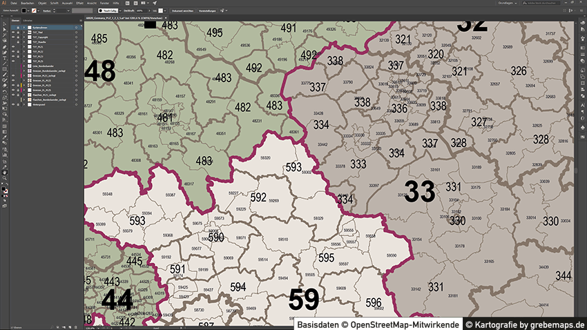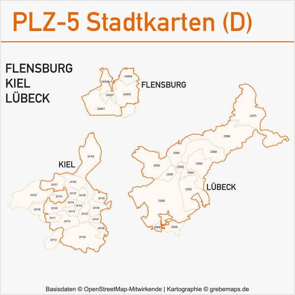 Grafisch aufbereitete Basiskarten mit Postleitzahlen-Bereichen (Plz-5) zu Großstädten und Städten in Deutschland als Gebietspolygone für Illustrator mit Bezeichnungen der PLZ-Polygone (5-stellig). Die Karten können unter www.kartendesign.de oder unter www.grebemaps.shop als Download gekauft werden.