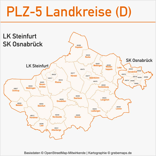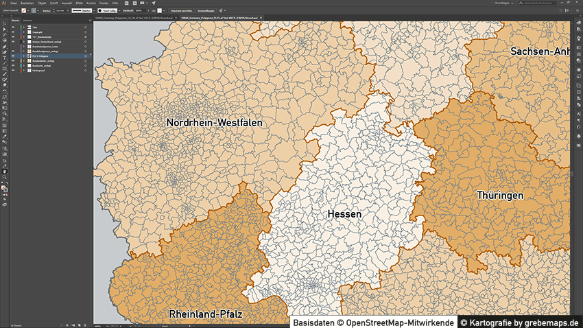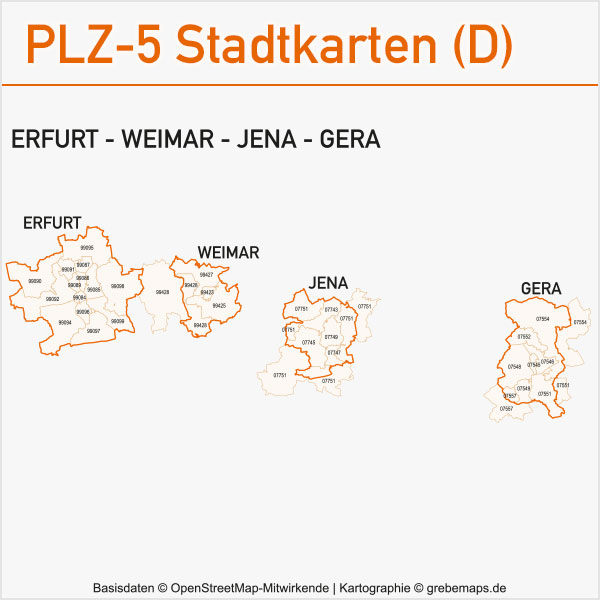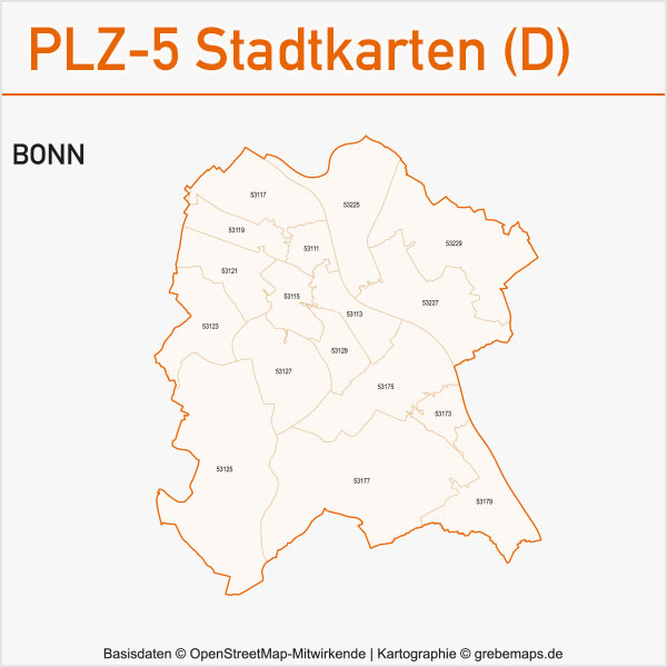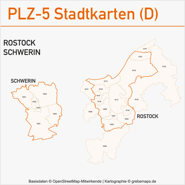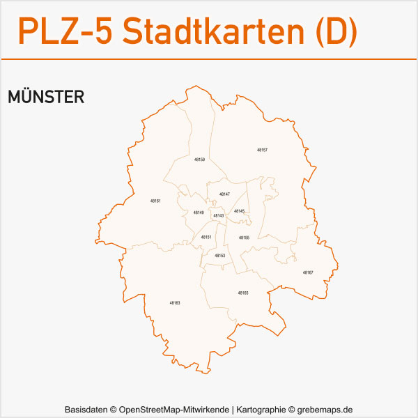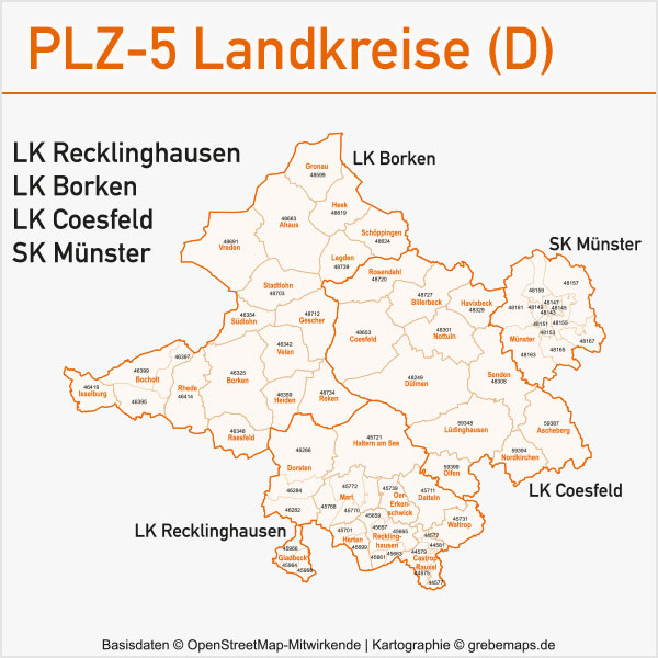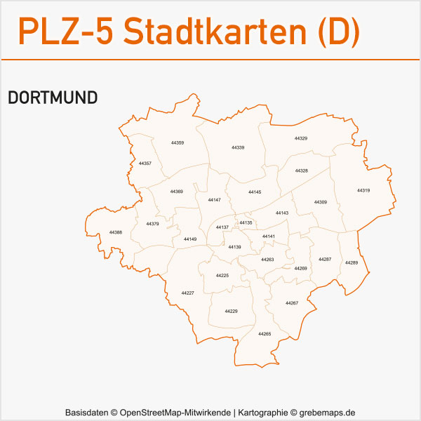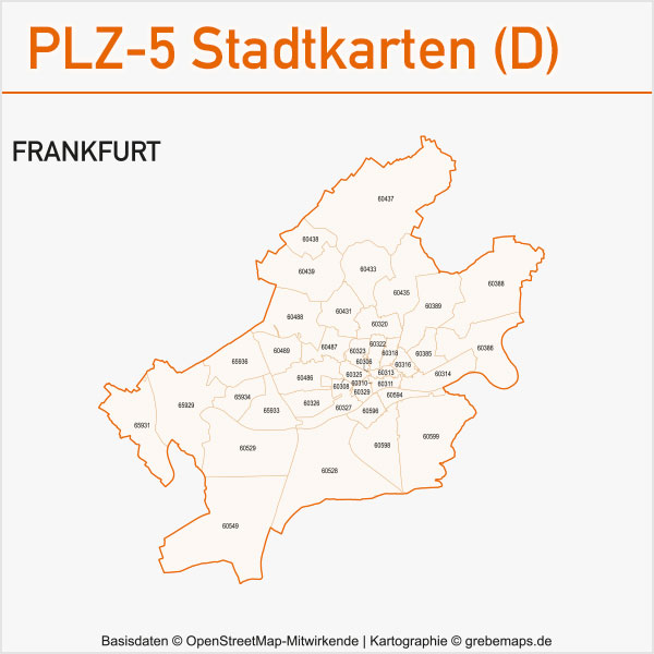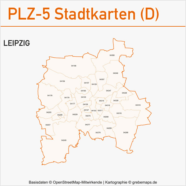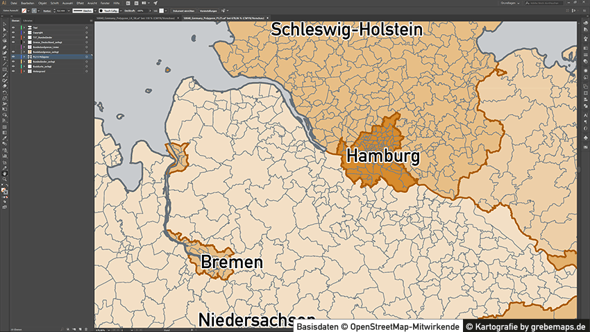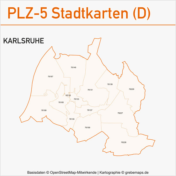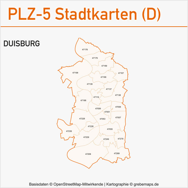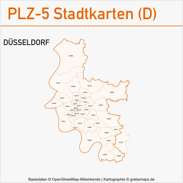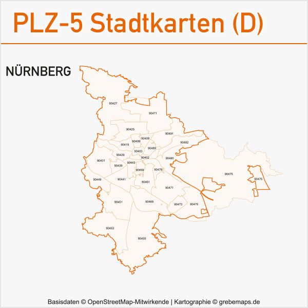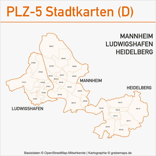 Grafisch aufbereitete Basiskarten mit Postleitzahlen-Bereichen (Plz-5) zu Großstädten und Städten in Deutschland als Gebietspolygone für Illustrator mit Bezeichnungen der PLZ-Polygone (5-stellig). Die Karten können unter www.kartendesign.de oder unter www.grebemaps.shop als Download gekauft werden.