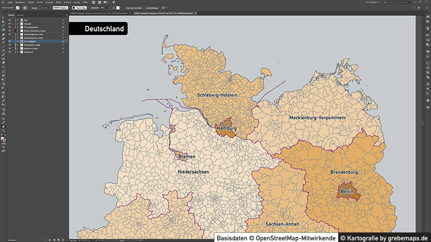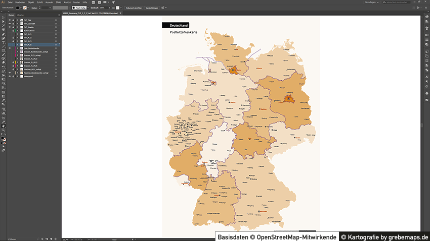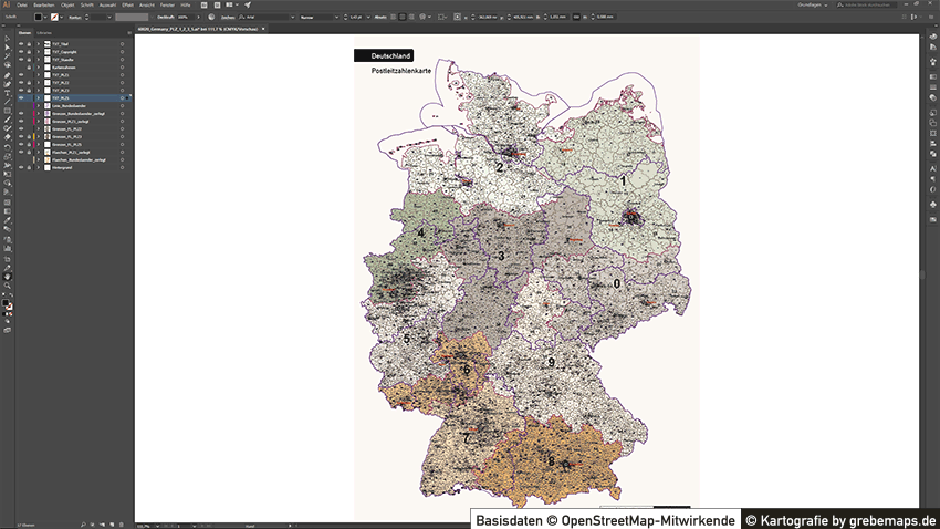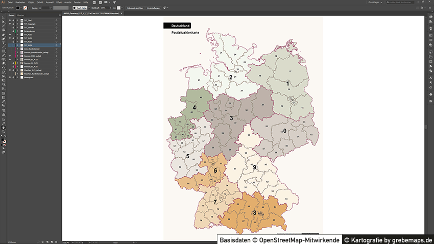 Wir erstellen Ihnen eine Deutschland-Karte, Bundesland-Karte , eine Landkreis-Karte oder eine Stadtkarte mit Postleitzahlen (5-stellig, 3-stellig oder 2-stellig) aus kostenlosen und lizenzfreien OpenStreetMap-Daten als Übersichtskarte oder Basiskarte für Ihre Zwecke für Illustrator und/oder PowerPoint. Je nach Disponibilität, Datenqualität oder Komplexität der OpenStreetMap-Daten enthält die Karte die fünfstelligen Postleitzahlen-Bereich und auf Wunsch weitere administrative Grenzen (Regierungsbezirke, Landkreise, Stadtkreise, Gemeinden). Ebenso kann die Karte mit weiterer Topographie (Autobahnen, Bundesstraßen, Gewässer, Siedlungsfläche) erstellt werden.
