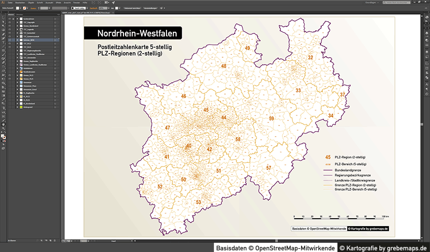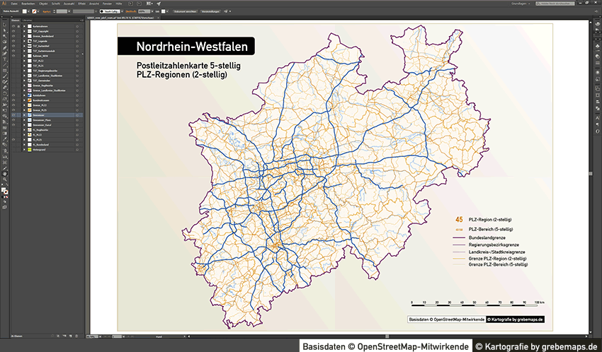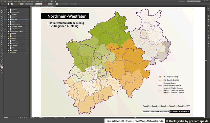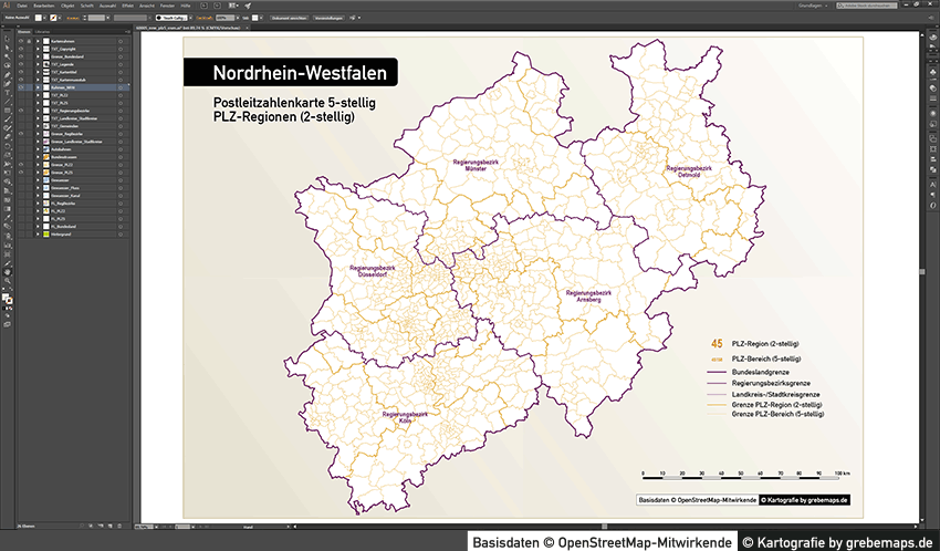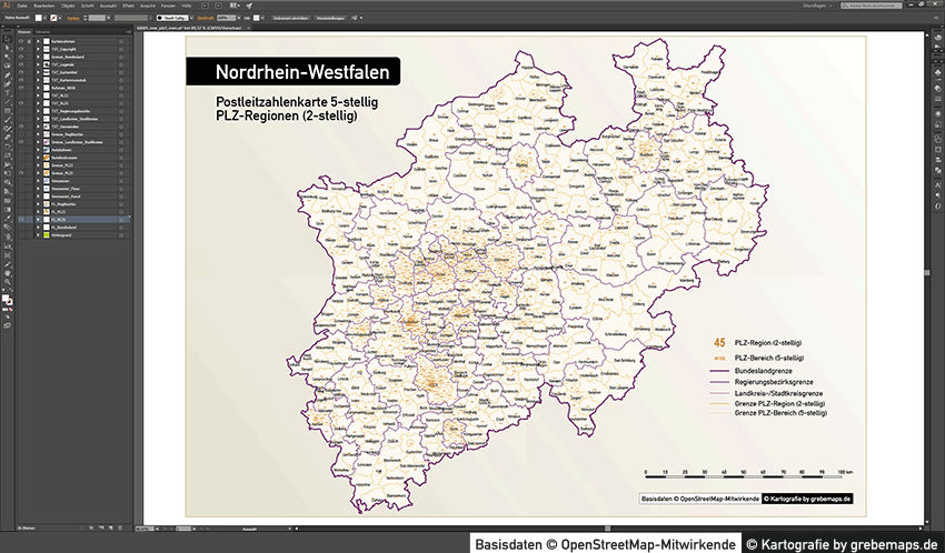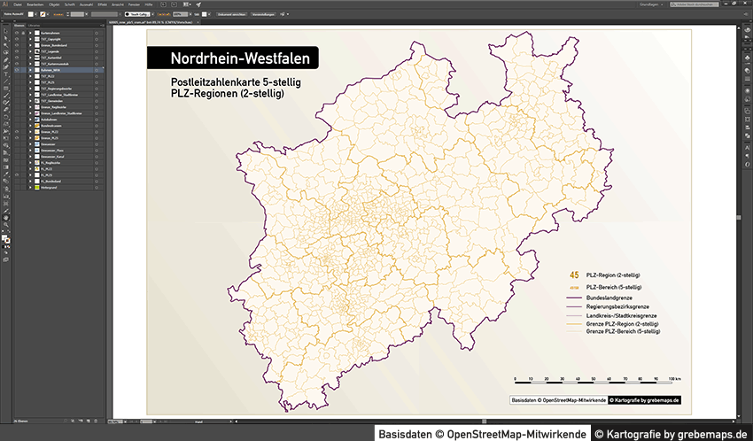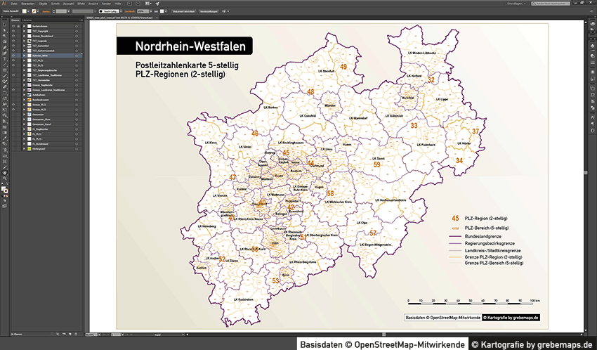 Diese fertig aufbereitete Bundesland-Karte mit Postleitzahlen für Nordrhein-Westfalen (NRW) für Illustrator mit Postleitzahlen-Bereichen (5-stellig) und Postleitregionen (2-stellig) mit Bundeslandgrenze, Regierungsbezirken und Landkreisen / Stadtkreise zeigt Ihnen eine beispielhafte mögliche Visualisierungs-Umsetzung. Diese fertige Karte „Postleitzahlenkarte NRW 5-stellig“ können Sie unter www.kartendesign.de erwerben und als Download-Link erhalten.