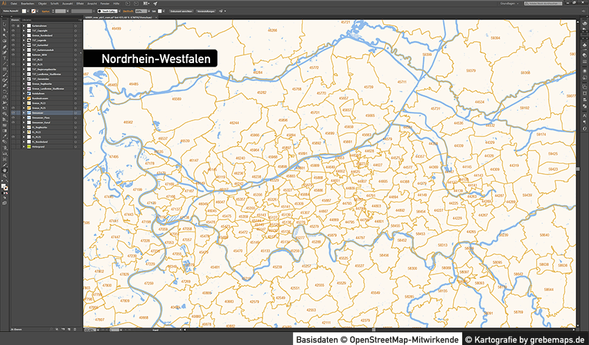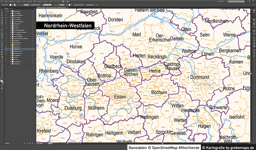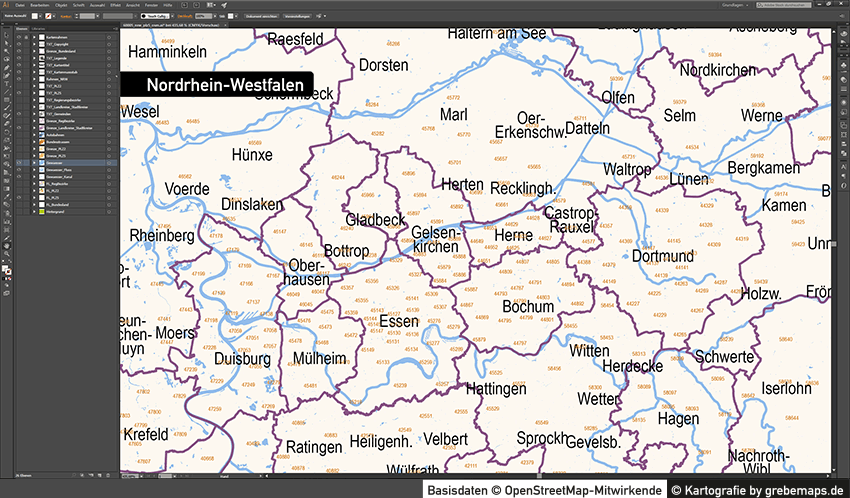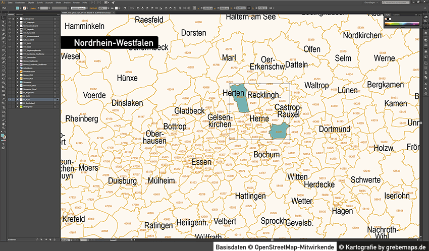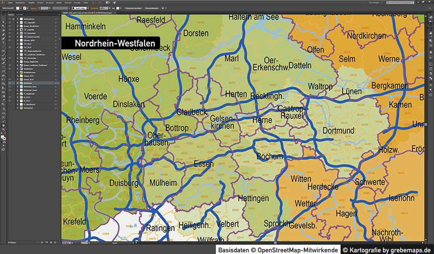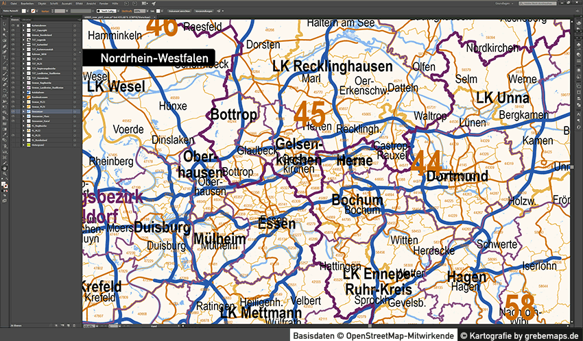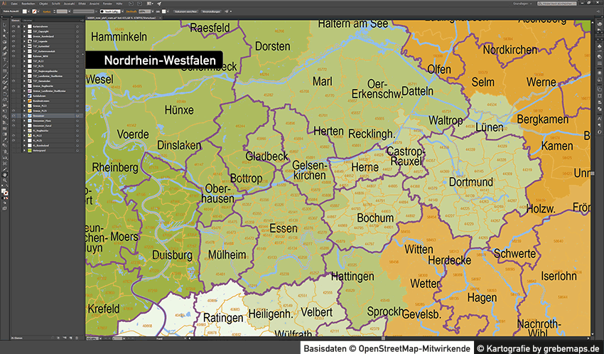 Postleitzahlenkarte Vektor für Nordrhein-Westfalen oder andere Bundesländer für Illustrator als Vektorgrafik