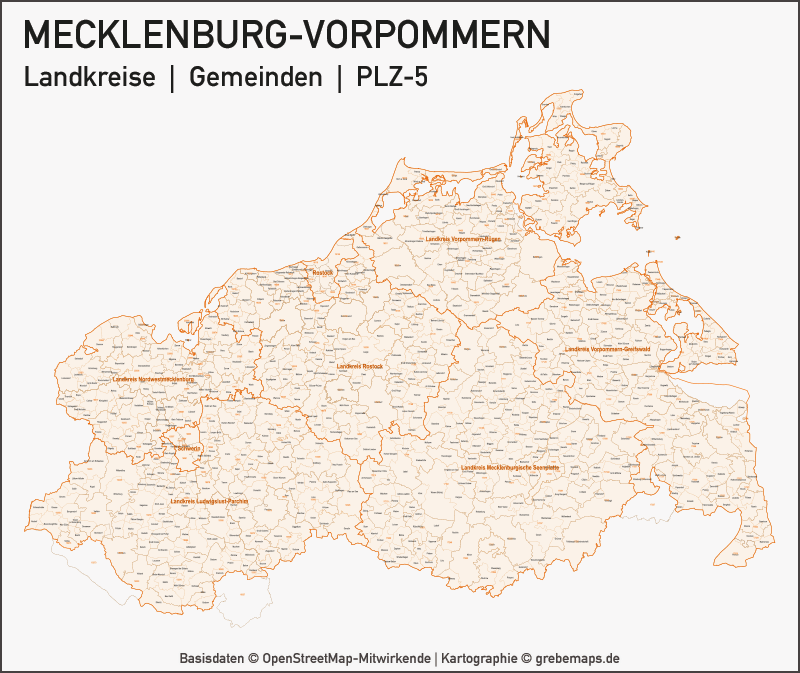 Mecklenburg-Vorpommern Vektorkarte Landkreise Gemeinden PLZ-5