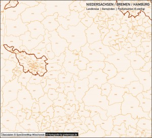 Niedersachsen / Bremen / Hamburg Vektorkarte Landkreise Gemeinden PLZ-5, PLZ-Karte Niedersachsen, Karte Gemeinden Niedersachsen, Karte Landkreise Niedersachsen, Vektorkarte Niedersachsen