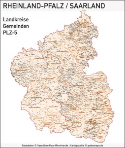 Rheinland-Pfalz Saarland Vektorkarte Landkreise Gemeinden PLZ-5, Karte PLZ, Vektorkarte Rheinland-Pfalz, Karte Vektor, AI