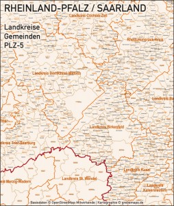 Rheinland-Pfalz Saarland Vektorkarte Landkreise Gemeinden PLZ-5, Karte PLZ, Vektorkarte Rheinland-Pfalz, Karte Vektor, AI