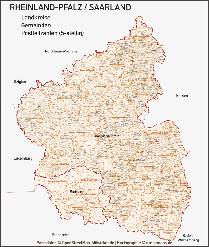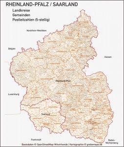 Rheinland-Pfalz Saarland Vektorkarte Landkreise Gemeinden PLZ-5, Karte PLZ, Vektorkarte Rheinland-Pfalz, Karte Vektor, AI
