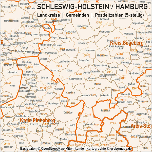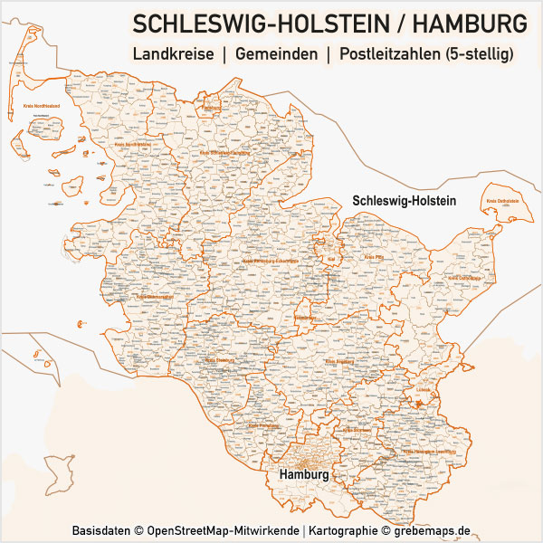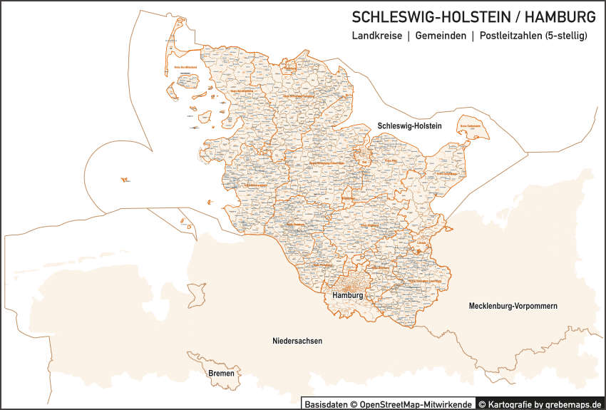 Schleswig-Holstein / Hamburg Vektorkarte Landkreise Gemeinden PLZ-5
