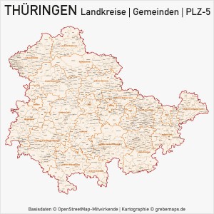 Thüringen Vektorkarte Landkreise Gemeinden PLZ-5